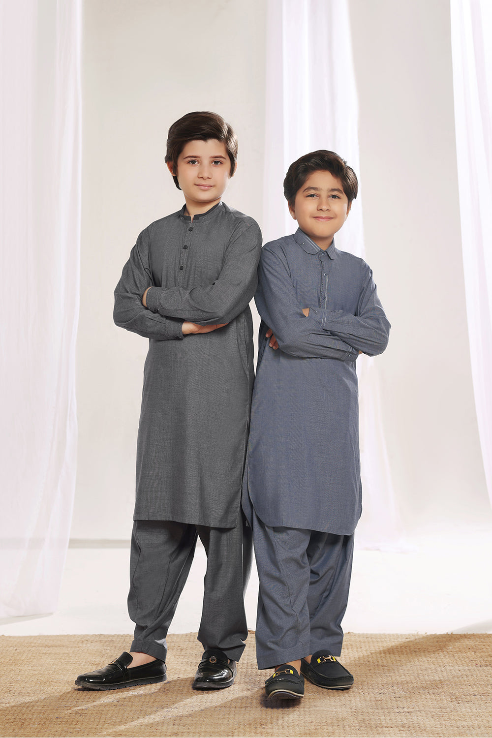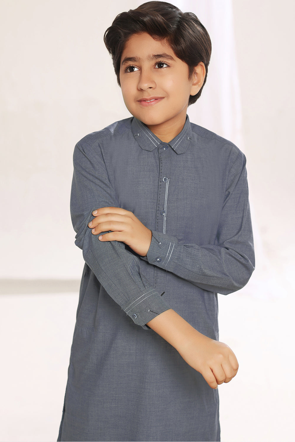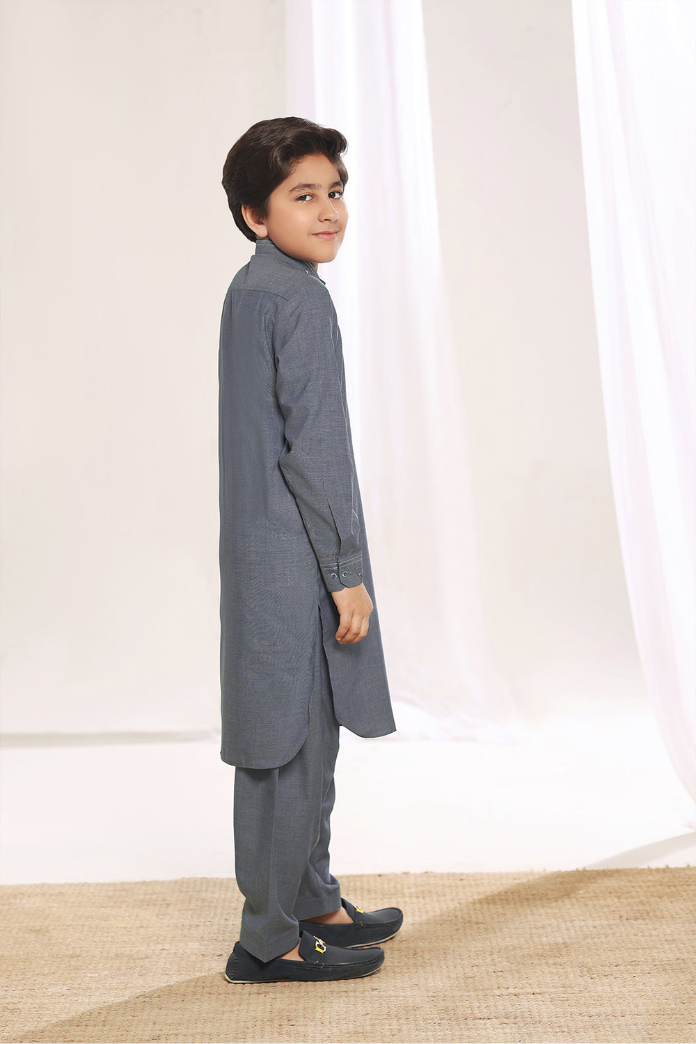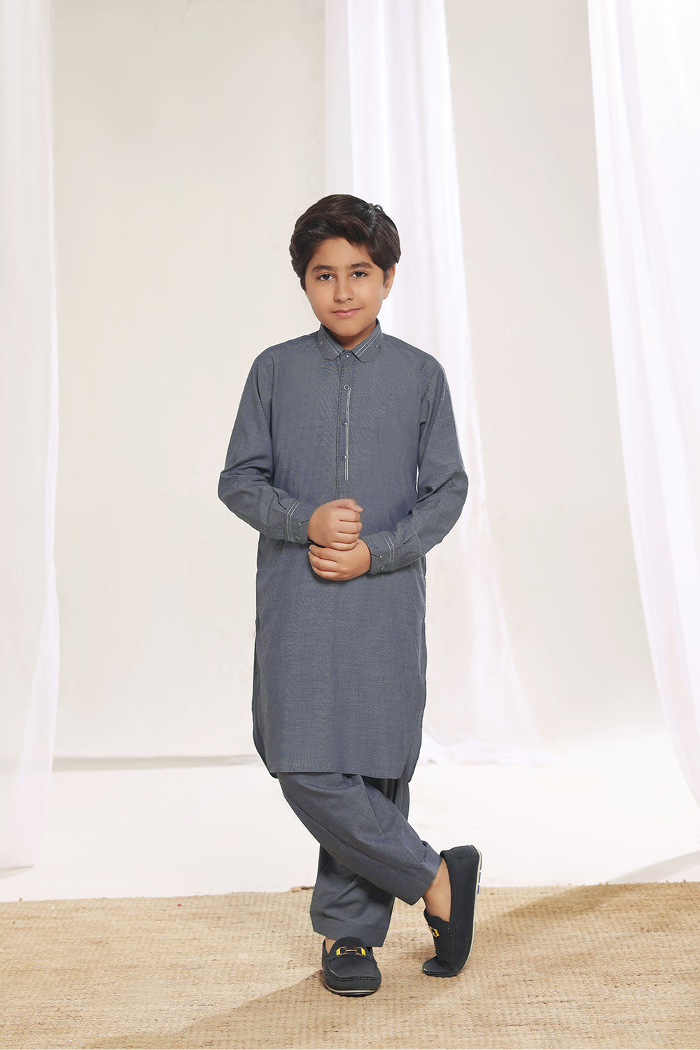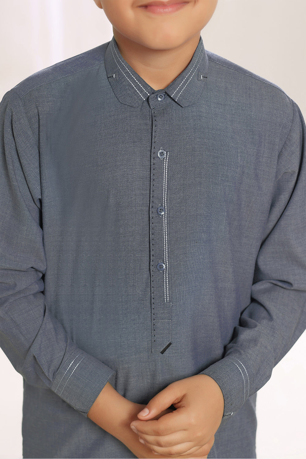 This denim blue wash & wear boys kurta shalwar is designed with a classic shirt collar for a smart appearance. Enhanced with contrast colour piping and fine stitching details, paired with matching buttons to complete the stylish look. Comfortable, durable, and perfect for festive and casual wear.
