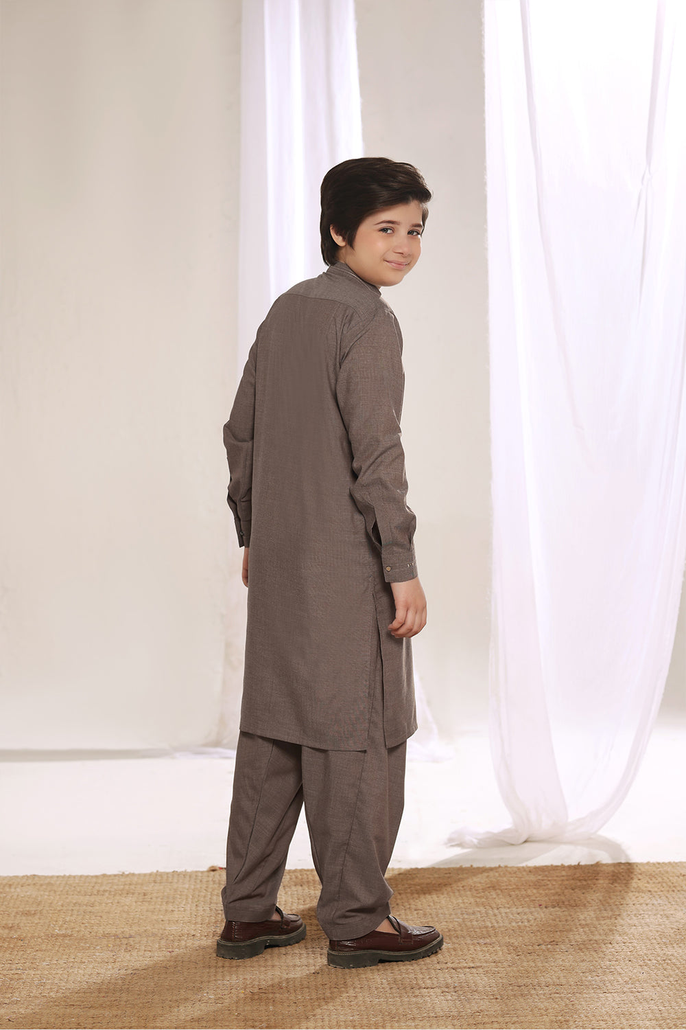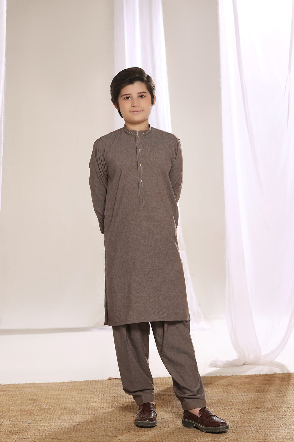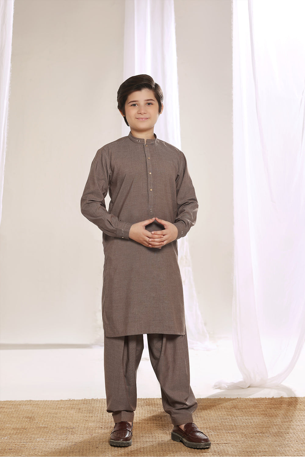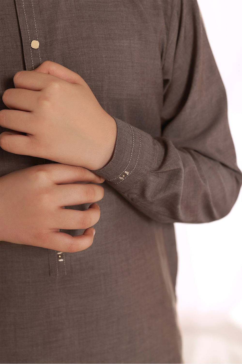 A classic boys kurta shalwar in rich brown colour, designed with elegant matte gold tich buttons. Detailed with contrast colour stitching and enhanced by metal rivets on the placket and cuff, giving a refined yet modern festive look - perfect for festive and formal wear.